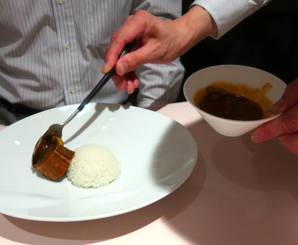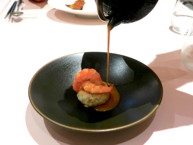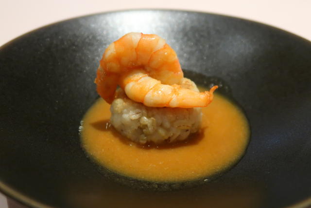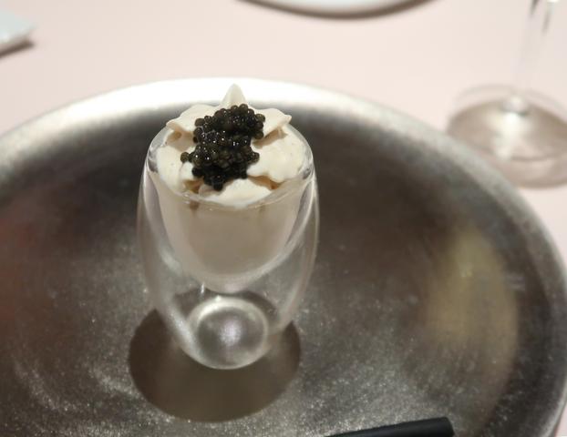 クリーミーで甘くて軽いほうじ茶の泡に中粒のキャビアの塩。中にはうずら玉子とねっとりとした求肥っぽいのも入っていて独創的。