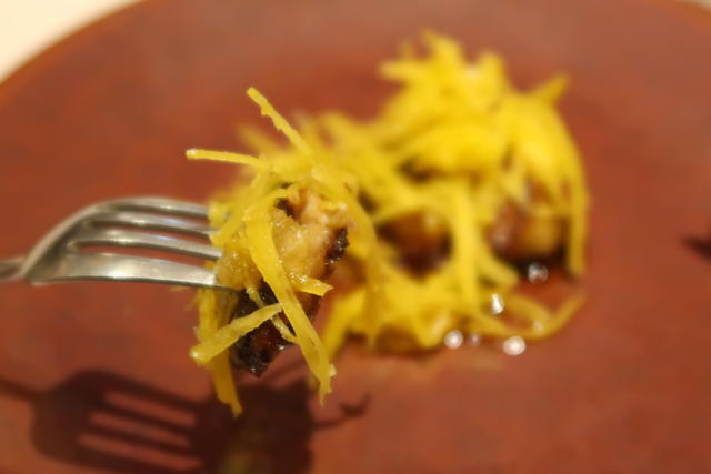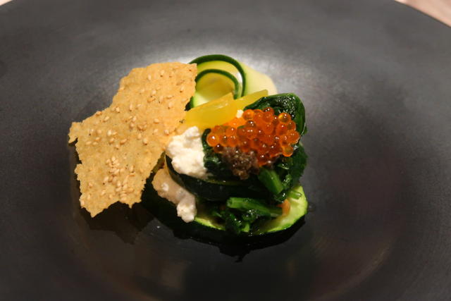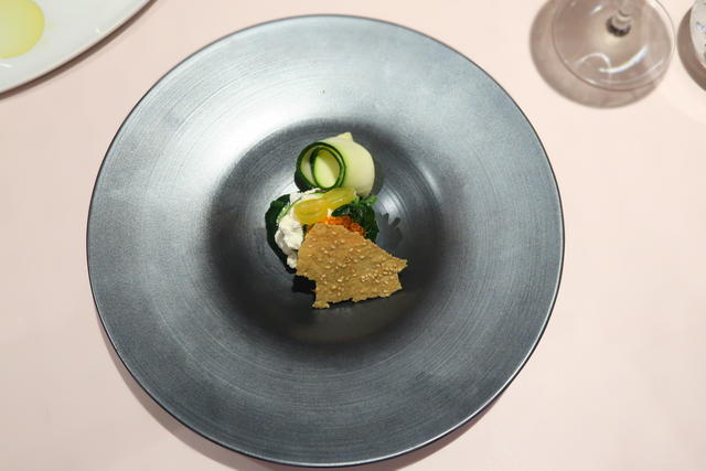 香ばしいチーズとごまのチュイールをバリバリとくずして、2種類の切り方で食感を変えたズッキーニとともにいただきました。