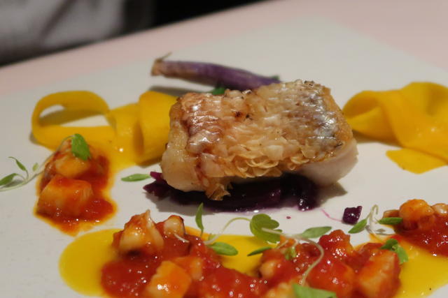 「能登、金沢から直送の鮮魚」料理は甘鯛でウロコがサクサクで香味野菜の効いている烏賊とトマトのソースも美味でした。(シェア)