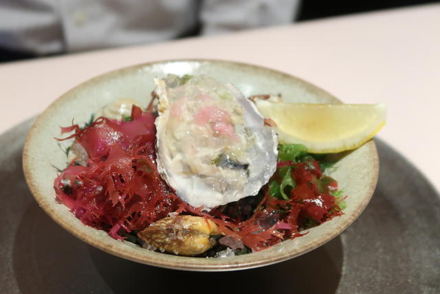 砂利と海藻を敷いた上に殻付きの小ぶりな牡蠣があって、海を連想するステキなビジュアルでした。生牡蠣もとっても美味しかったそう。