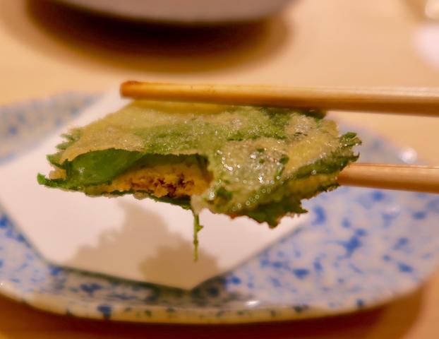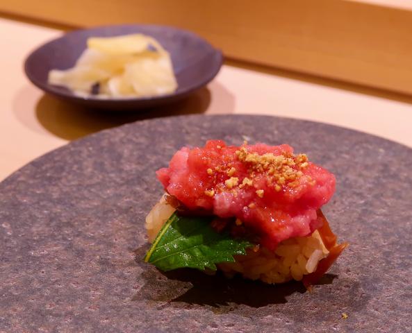 たまり醤油漬けにした黒い沢庵を使っていて、たしかに塩より醤油の風味で頂けるのが良いかも。ほんと、いろいろ考えられているのね〜。後から大葉の香りがくるのも良い感じ。