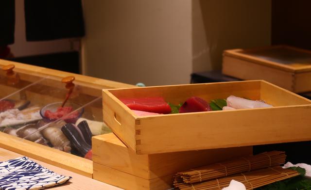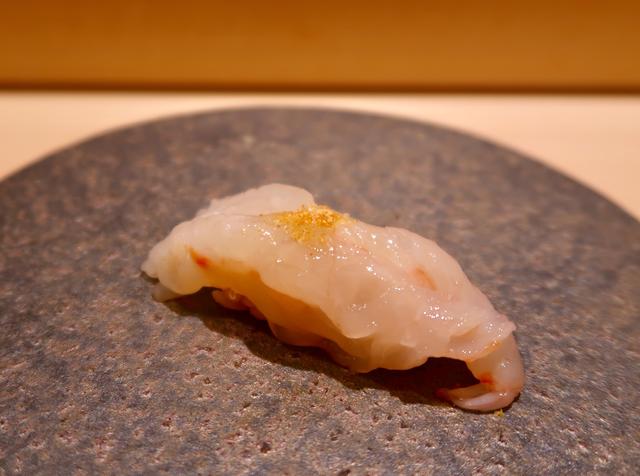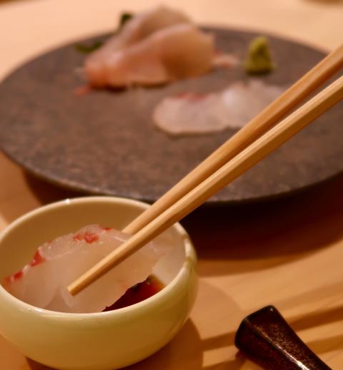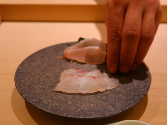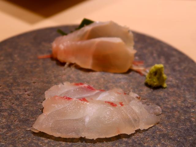 お寿司のようにポンとお皿に置かれたのは、ポン酢で食べる真鯛と、昆布じめをして熟成をかけているアイナメ。