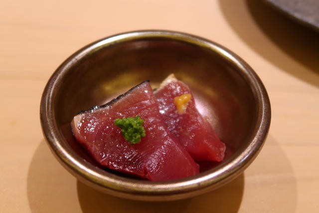 戻りガツオらしい。自家製の燻製塩で。つやつやと美しく思わず見入ってしまった。一方にはネギ生姜、もう一方には和がらしが載せてあり、違う味わいが楽しめて気が利いている。