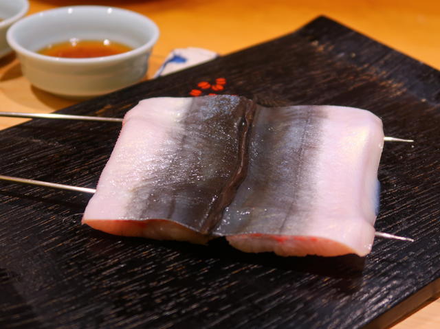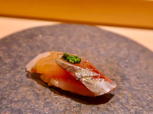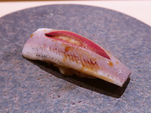美しい包丁入れ。またネギ生姜を細かく叩いたようなものが載っている。上品で良い感じ。舌触りが良い。光り物、ほんと好き。