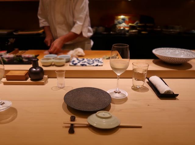 杉の一本板のカウンター。スマホやカメラはいつもと違って膝の上に。