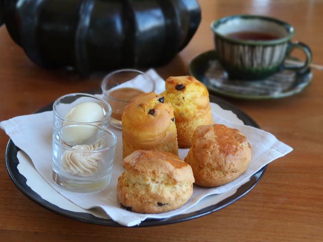 マフィンぽい「パンプキン&チョコ」にはミルクジャム、「オレンジ&レーズン」にはクロテッドクリーム。シナモンバターどちらにも合うようです。