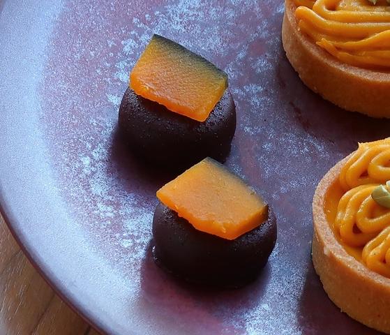 かぼちゃの蜜煮がのったボンボンショコラは、甘酸っぱい木苺とカカオのアロマが楽しめました♪