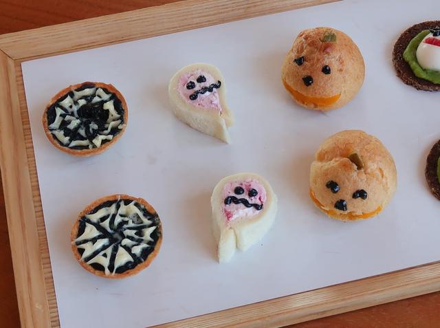 ストロベリークリームチーズのパン「おばけ」や、スイートポテトとポテトサラダをミックスしたような「蜘蛛の巣」も楽しく美味しいセイボリー。