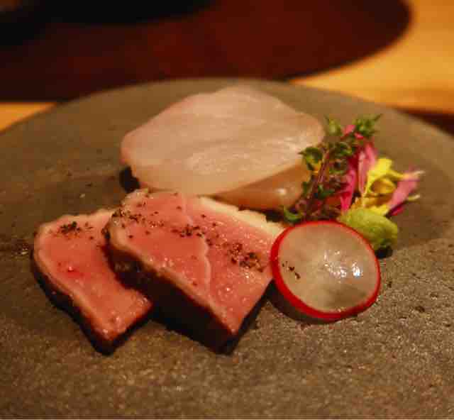 合鴨ロースのタタキは脂がのっていて、噛み締めると旨味が滲み出ます。