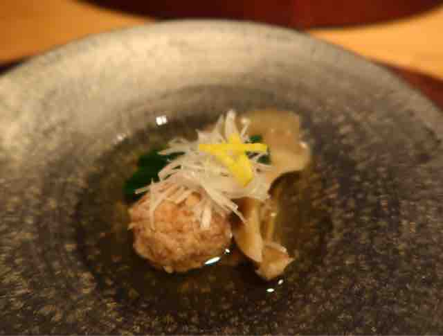 鶏つくねと舞茸春菊の炊き合わせ、松葉ゆず 針葱。