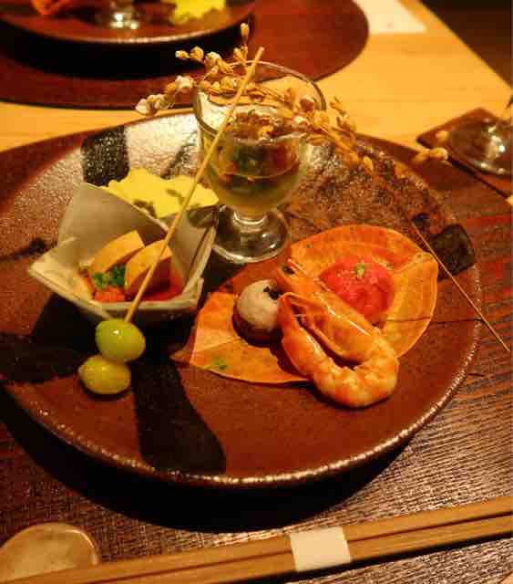 あん肝ポン酢、藻塩をふった新潟 越後牛の和牛手毬寿司、衣かつぎ芋、小松菜としめじの煮浸し、車海老芝煮、稲穂素揚げ、銀杏串、栗の葉、いちょう。