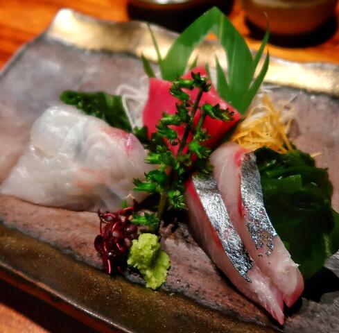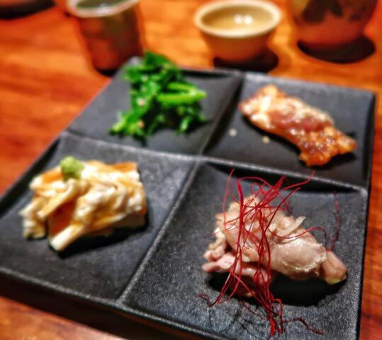 「明日葉の胡麻和え、富士山鮭の酒盗のせ、鶏はらみの葱塩炒め、生湯葉の刺身」