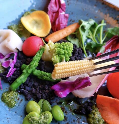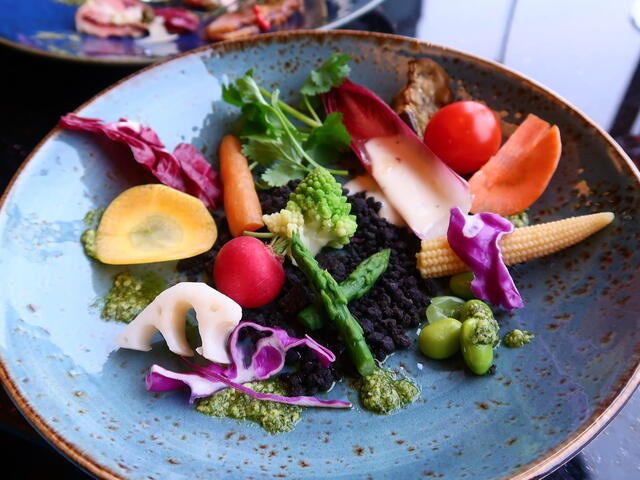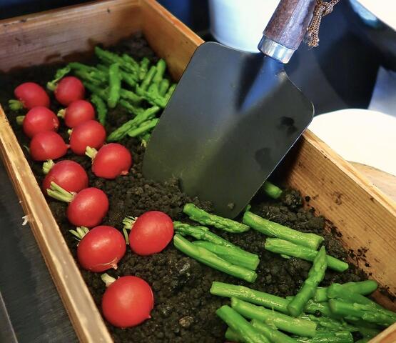 ココアクランブルでできた"土“を畑に見立てたサラダ。