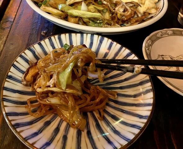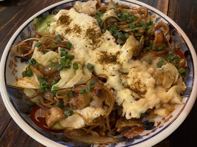 ホルモンまたは豚肉(チョイス)入り、2種類のそばの合い盛り焼きそば!