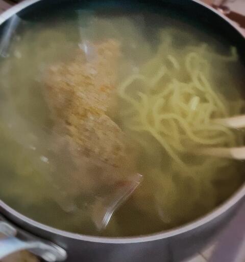 麺とミンチ(袋入り)を一緒に茹でると書いてあった。
