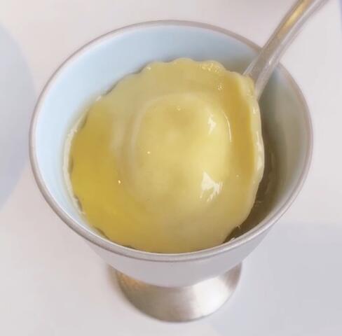 鴨ブイヨンのスープにゴルゴンゾーラのラビオリ入り。
