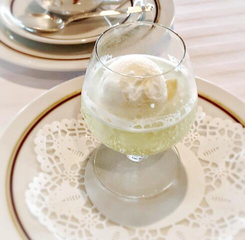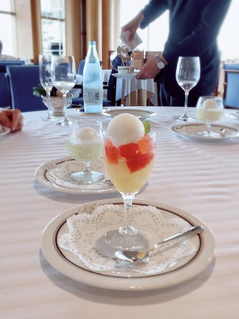 モヒートのジュレにヨーグルトアイスの爽やかな日替わりデザート(この日はカンパリジュレとグレフルのシャーベット)とコーヒーもいただきました。