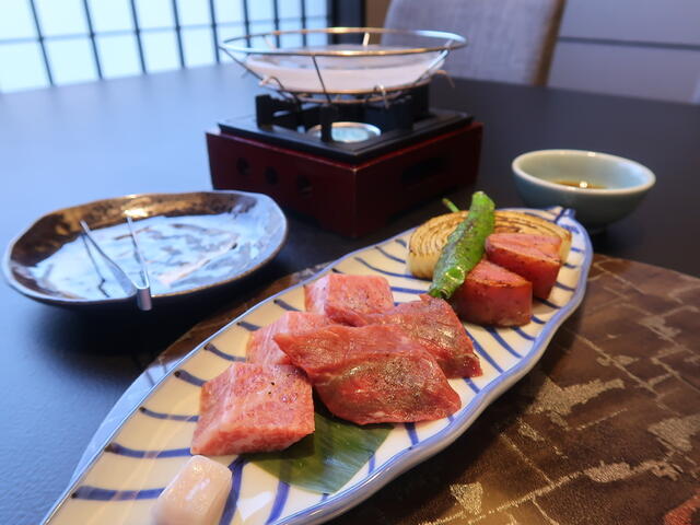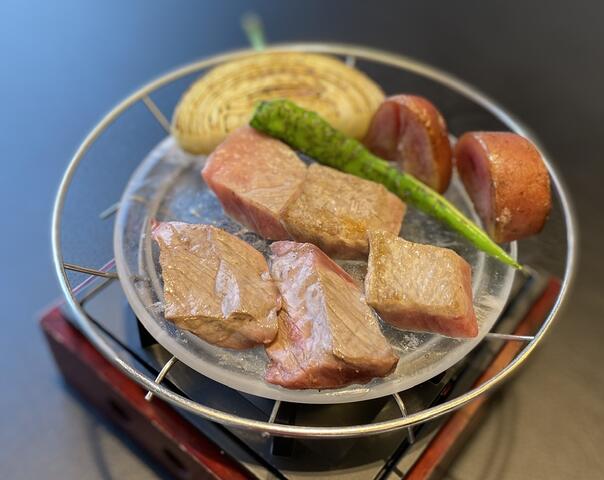 [焼物]なにわ黒牛と野菜の水晶焼き 大阪産和風卸しソースにて(大阪府泉佐野市射手矢農園のプレミアム泉州たまねぎ/大阪府富田林産馬鈴薯・万願寺)