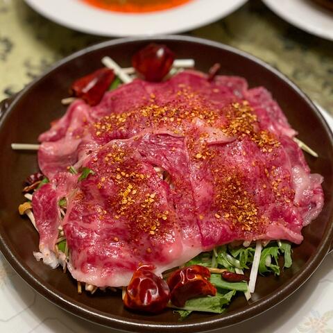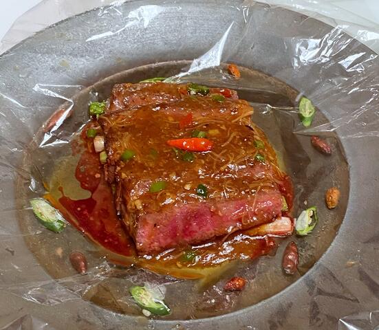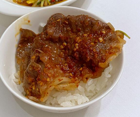 分厚い和牛サーロインはピリ辛で一層美味しい❣️