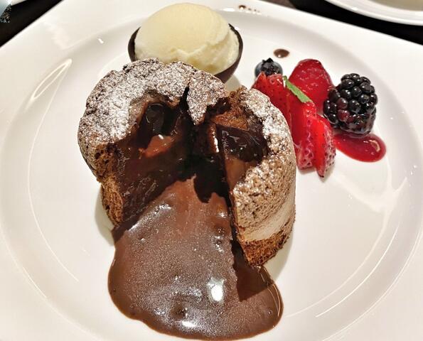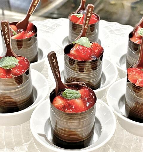 チョコカップに入ったバニラアイスとフルーツ添え。