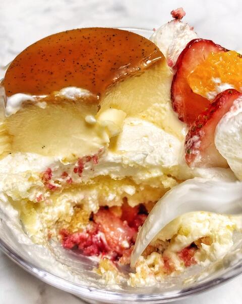 カラメルしっかりの固めのプリンの下にはオレンジキュラソーでしっとりとしたスポンジ、底にいちごのソース?が忍ばせてありました😆👍