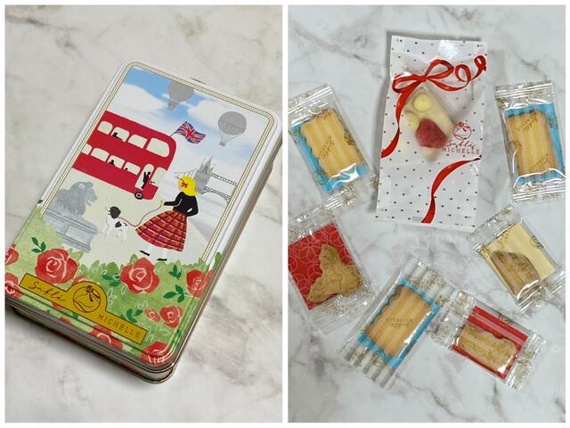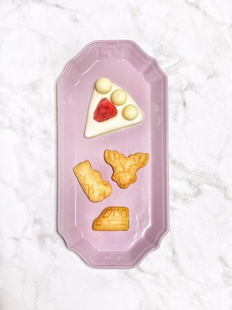 カカオの時計台、バターの兵隊さんと旗、抹茶の王冠、いちごのバラと二階建てバス、空をイメージした雲型サブレ、ピンクの金平糖。