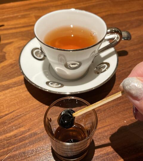 コーヒー又は紅茶でアールグレイ。黒豆のコーヒーリキュール入り蜜煮。いつも出るやつ。