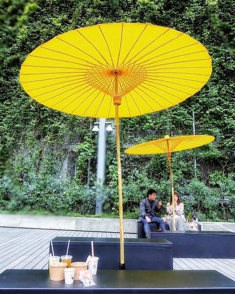 あざやかな黄色の野点傘(のだてがさ)、床几台(しょうぎだい)が設置されています。
