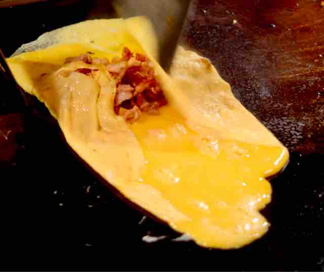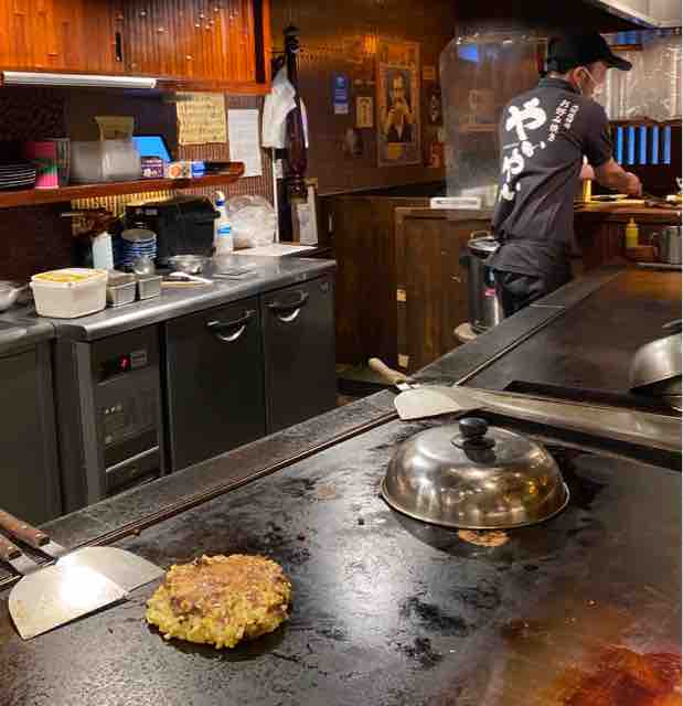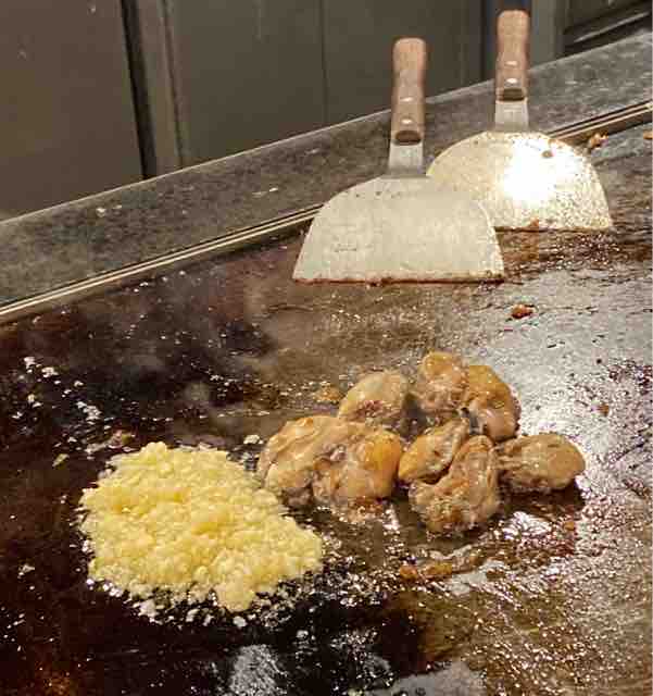 大きな鉄板の前のカウンター席に座りましqくぉ