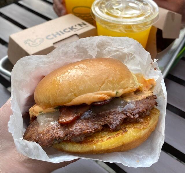 ホルモン剤フリーのアンガスビーフ100%ビーフパティ、カリカリのスモーキーベーコン、とろけるチーズ🧀