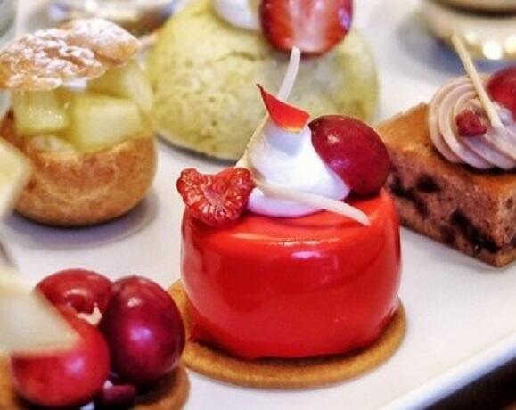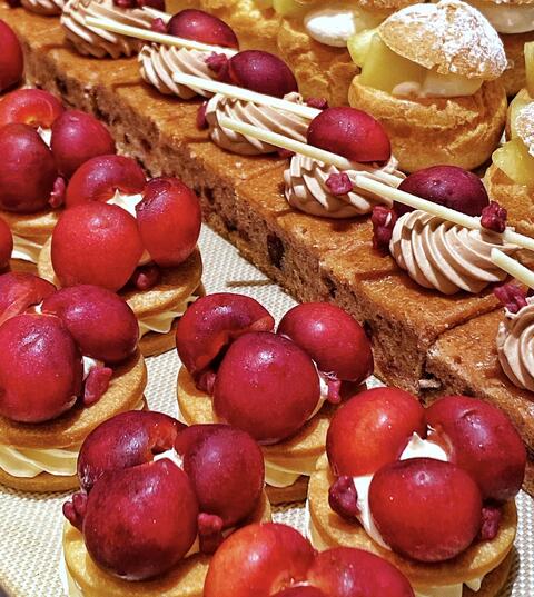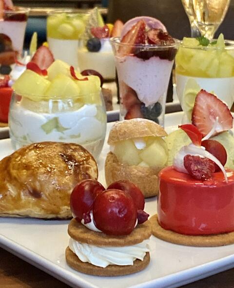 メロンショートケーキ、プリン.ア.ラ.モード、赤肉メロンゼリー、フレッシュチーズクリーム、メロン シュー ア.ラ.モード、赤い果実とチェリークリーム、バターサンドクッキー、ケーク クランベリー、チェリーパイ、ガトースリーズ、プチメロン、ピスタチオスリーズ