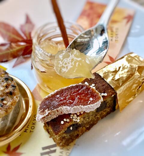 キヌアとドライフルーツのスパイスケーキには、洋梨とジンジャーのコンフィチュールをかけて。