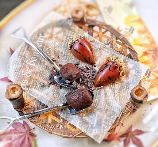 木の実に見立てた、ごぼうのショコラやくるみとプラリネの入ったボンボンショコラ🥜