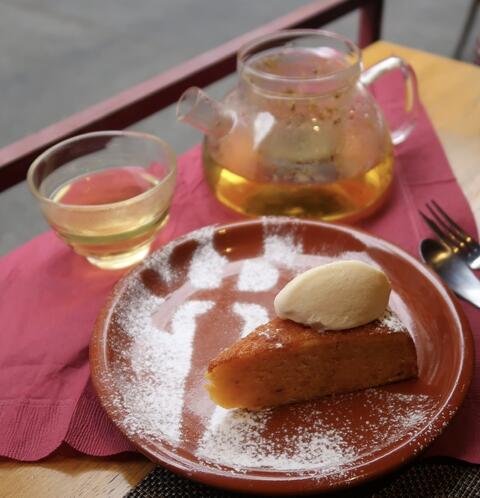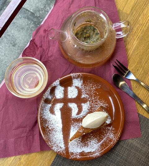 デザートはアーモンドがたっぷり入ったタルトに洋梨のアイスクリーム載せ🍐