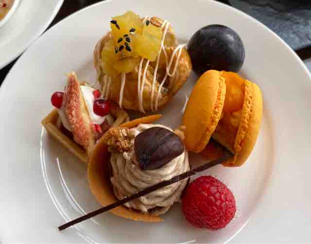果物や芋など秋の味覚がたっぷりの、カラフルで、フルーティーなアフタヌーンティーです🍇
