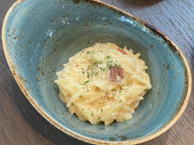 「アーモンドミルクを使った新感覚カルボナーラ」はライス状のパスタ。