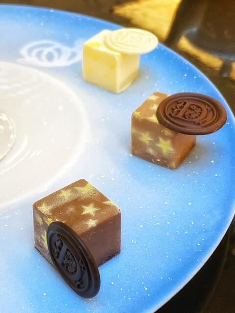 プレートはブルーのグラデーションが描かれ、ホワイトチョコ、55%カカオのチョコ、100%ピュアカカオフルーツのチョコ、ルビーチョコが味わえるムース。