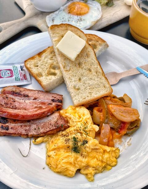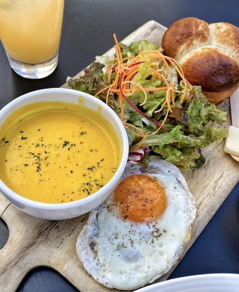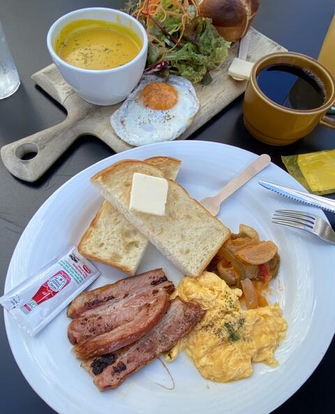 ふわふわ湯種パンとスープのセットと、スクランブルエッグに厚切りベーコンのトーストセットをシェアして食べたら、バランスも良くて大満足でしたー💕