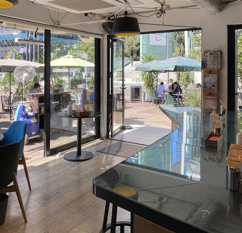 ビルの谷間にある人気のカフェ。