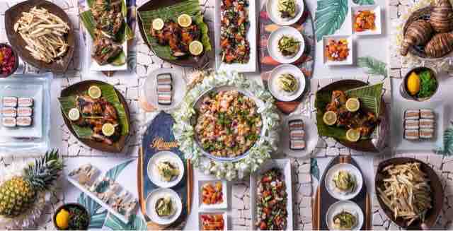 炙りマグロのポキ、ロミロミサーモン、スパムむすび、フリフリチキン、ポークリブのグリル グアバBBQソース添え、ハワイアンロコモコ、タロイモのフライドポテト、ガーリック・シュリンプ、マナプア・ポーク・バン、カルアポーク・キャベツ
