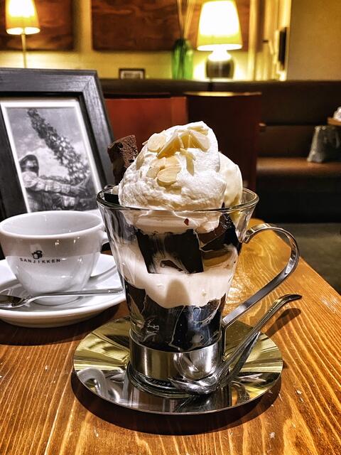 アイスクリームやホイップクリーム、煎ったコーヒー豆、ナッツなどが盛られていてパフェみたい。