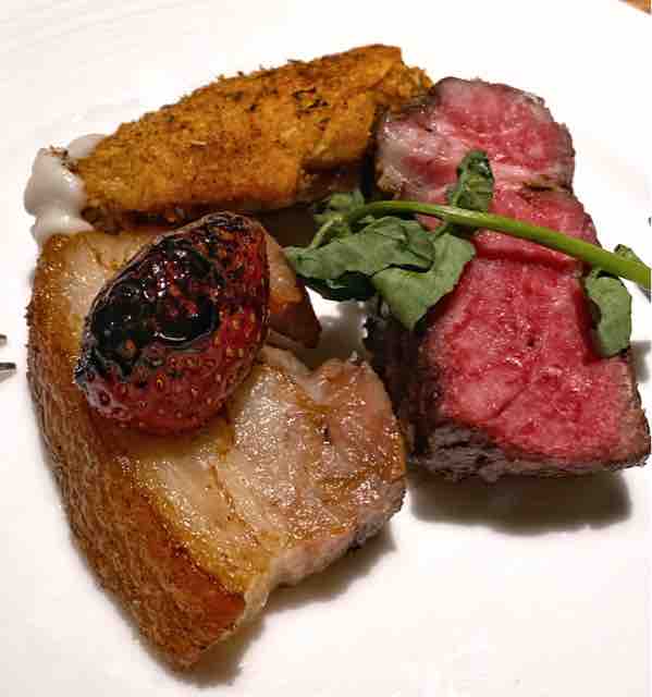 桜の薪でグリルする「牧草飼育牛のサーロイン」、苺に軽く火入れをし、バルサミコ酢の風味と共に味わう「ローストピットポークベリー」、「清流チキンロリーポップ セロリアックピュレ添え」。