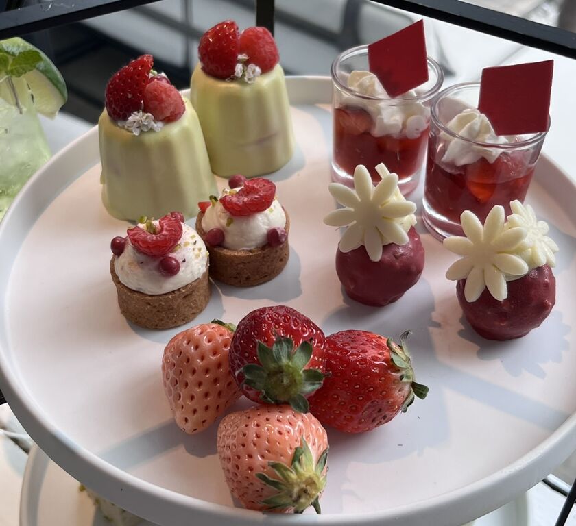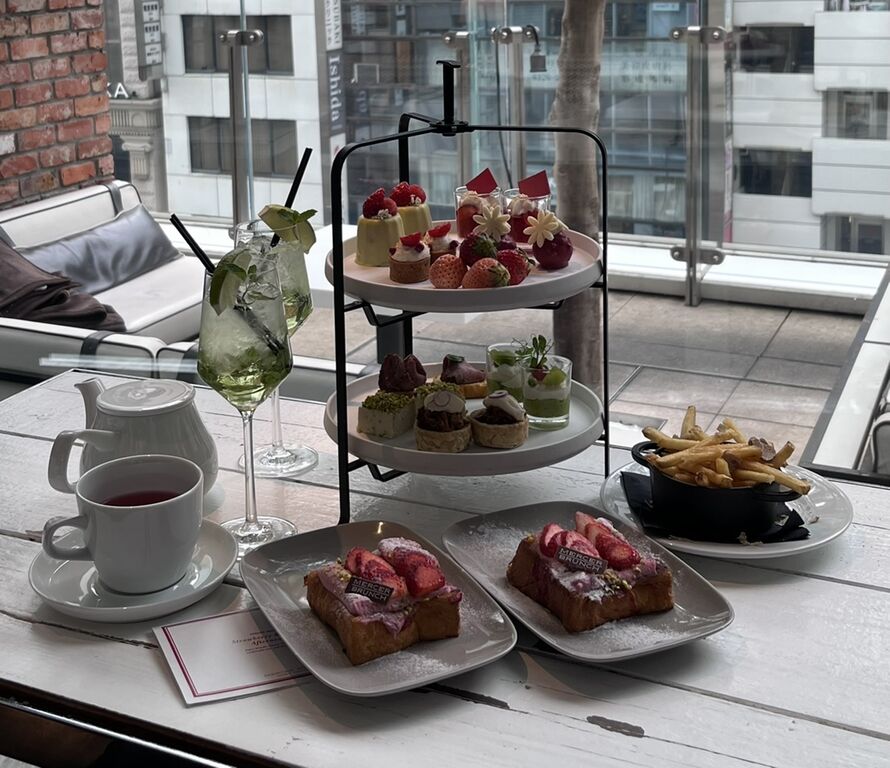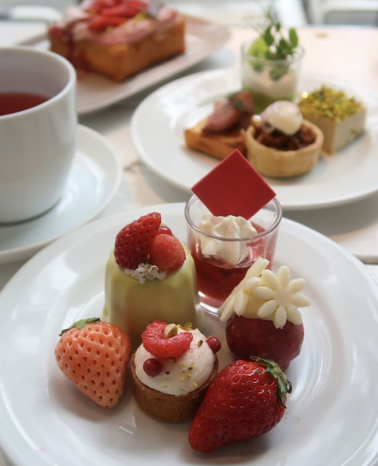 テラスを見下ろせる明るいお席で、苺が主役の春のアフタヌーンティーをいただきました。