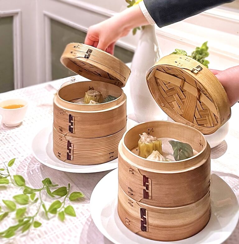 蒸篭で蒸したての3種の点心と中華ちまき。