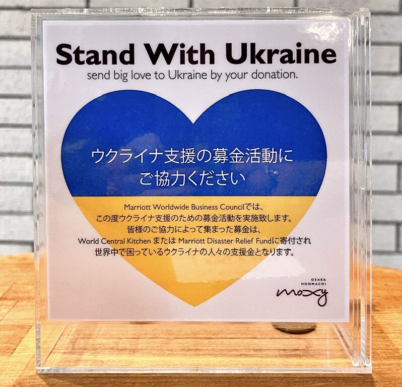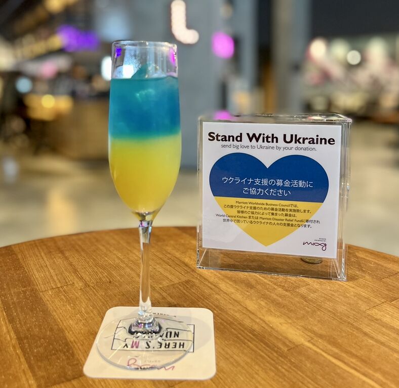 モクシー大阪本町の24時間オープンのバー「Moxy Bar」において、ウクライナを支援できるカクテルがいただけます。