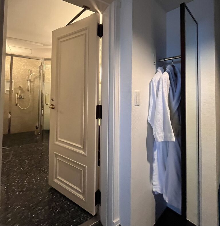 バスルームを出てすぐにローブをはおることができて快適。