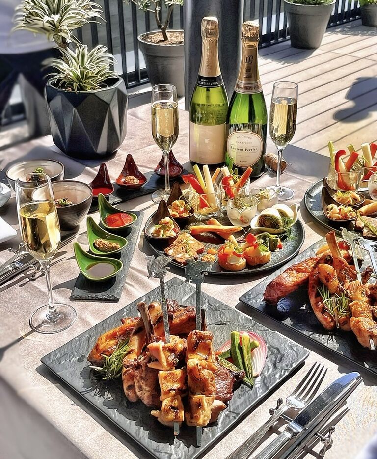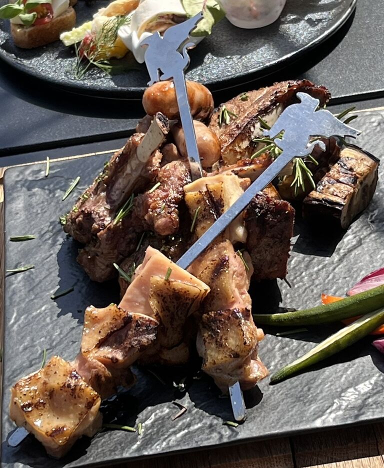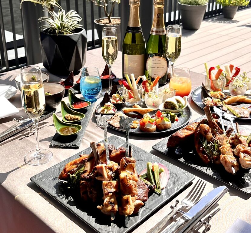 メインは「JW GARDEN」のハーブで下ごしらえされたスペアリブや、JWのスティックに刺さったチキン、ラムチョップ、ソーセージなどの豪華なグリル料理。