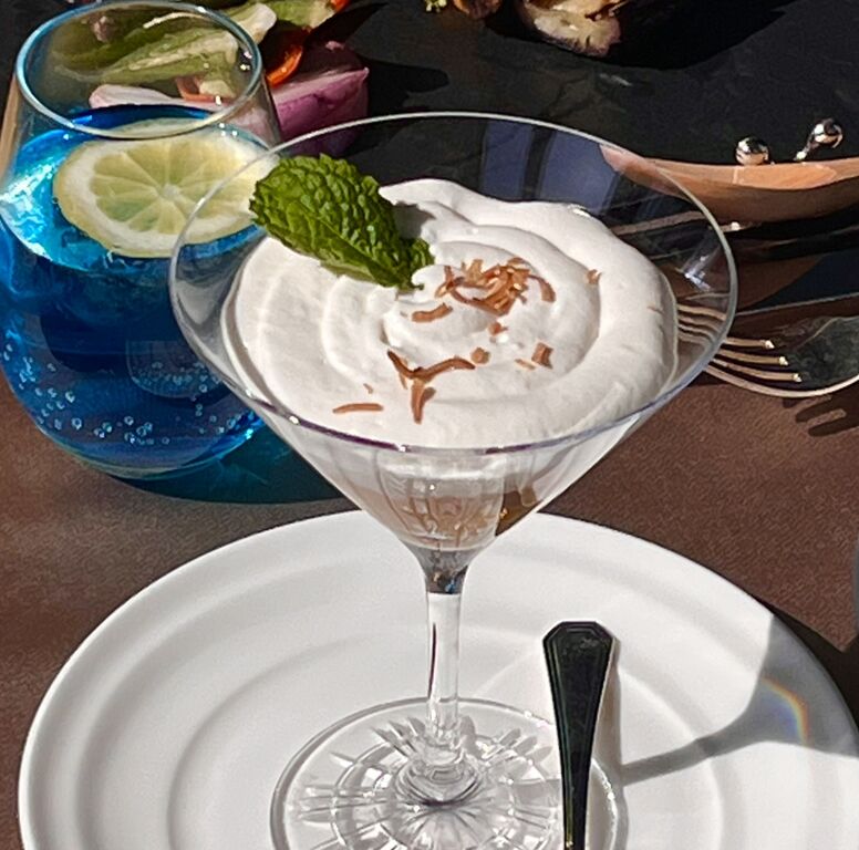 そして、脚つきグラスで供されるトロピカルフルーツとココナッツのムースのデザート。