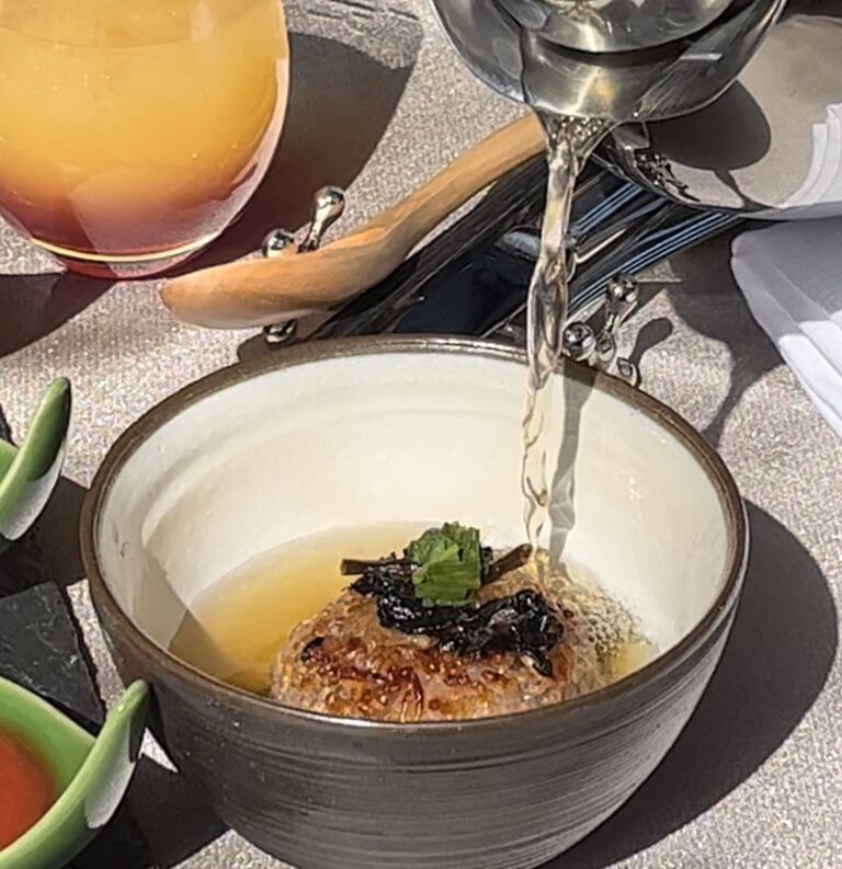 〆は、焼きおにぎりにチキンスープのだし茶漬けと、気が利いている♪