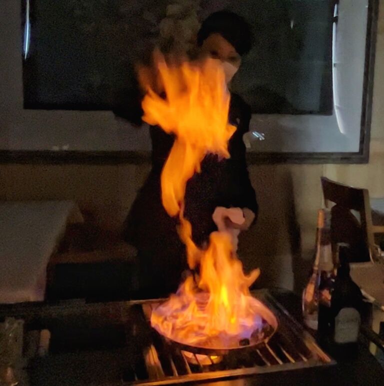 さらにスペシャルデザートとして、ワゴンサービスで「スリーズ・ジュビレ」の炎の演出🍒